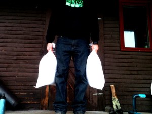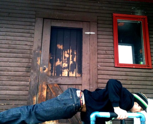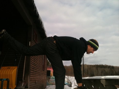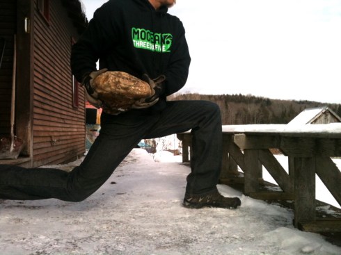 Move 3-Lunges– Another very basic move on its own or again you can add progressions. Here i’m doing some rotary movement, spiraling out over the front leg with the rock. Again its up to you and your level, desire, and time. Variety is great, mix it up and keep the body guessing and maybe the neighbors too if you have them. Any of these can be done with or without clothing for dramatic effect. This day was about 5 degrees so I opted for clothing cuz you know..shrinkage and all.
